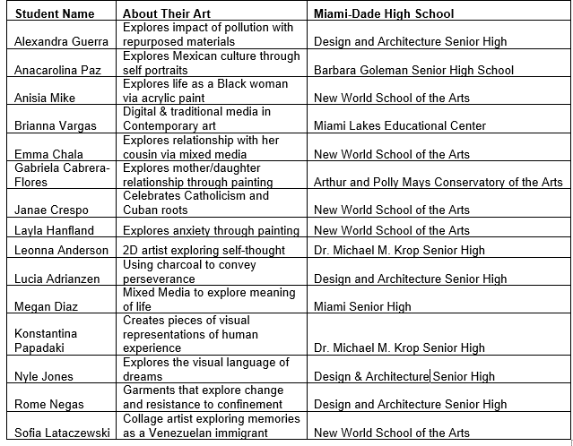 This year’s recipients use a variety of mediums to convey their relationship with their culture, religion, family and/or self. The 15 students represent the very best of Miami-Dade’s young creative talent. Most attended school on free or partially paid for lunches but are now headed to college with a little more money in their pockets. This year’s recipients include: