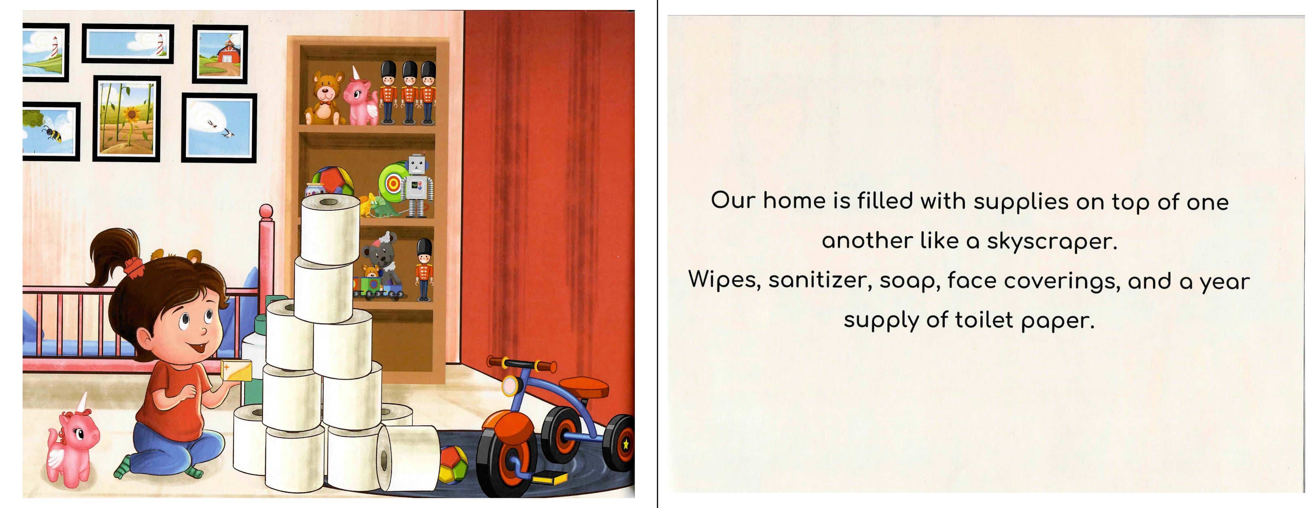 The self-published book entitled The Lockdown Baby, takes readers through a series of memorable chapters during the pandemic that were experienced by everyone around the world. Each page provides an animated depiction of life at home, through the eyes and mind of an infant. From being imprisoned in the house, and seeing an increased amount of personal and household hygiene products, to witnessing mommy and daddy wearing unusual face coverings and food being delivered to the door (instead of the usual outing to a favorite restaurant or café), the often humorous portrayal of life during Covid-19 includes the depiction of online toys being out-of-stock and a new parental “hobby” at home known as Zoom.